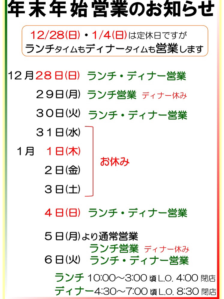 年末年始 日曜営業します