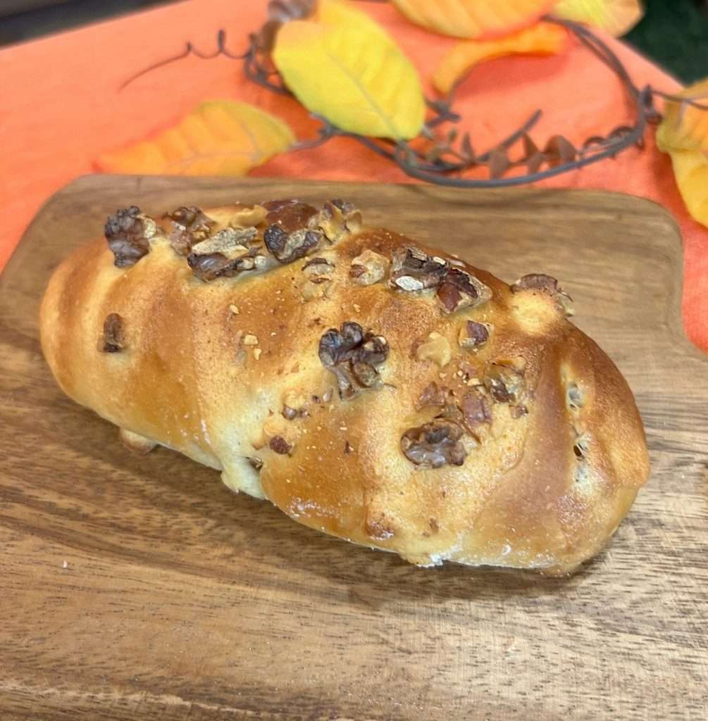 新 商 品! カルフォルニア産くるみをたっぷり使った生地にソフトクッキー生地をトッピング。口どけの良いパンに合わせてクルミ感が味わえるようになっています。 1個 235円
