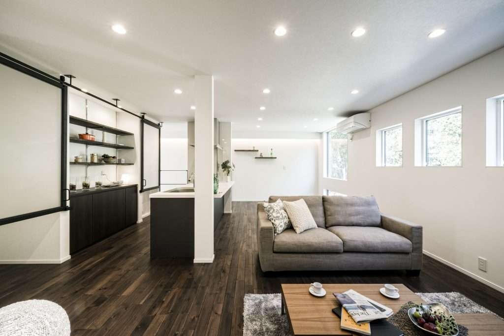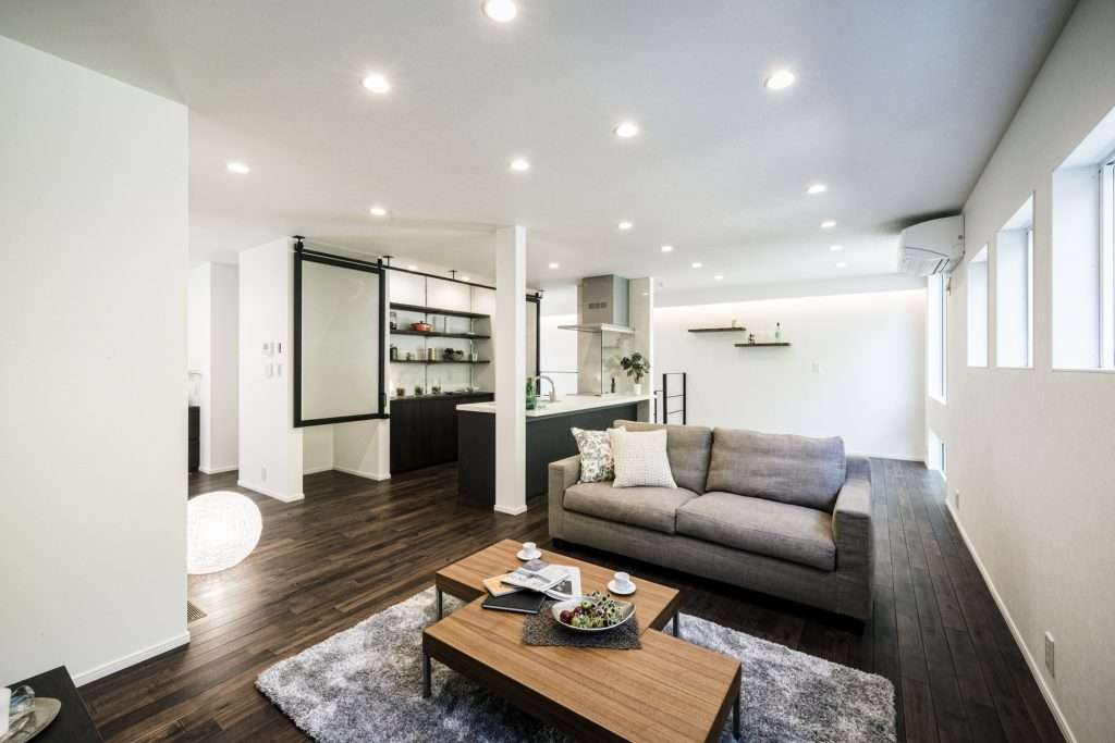 キッチンで料理をしながら、ソファでくつろぐ家族の様子が自然と目に入るLDK。