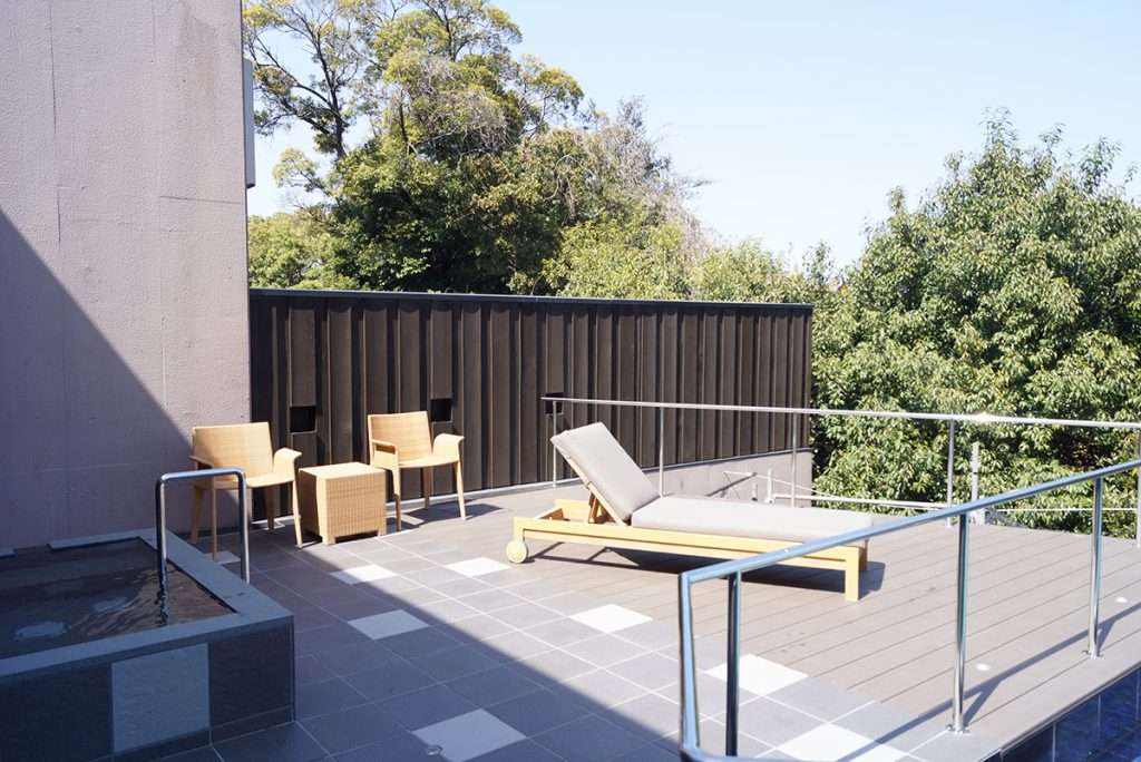 露天風呂は深さ120cmの“深湯”。自社源泉かけ流しのとろみのあるお湯は「美人の湯」として人気で、保湿・保温・美肌効果も期待できるナトリウム炭酸水素泉です。