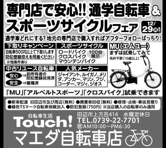 あけましておめでとうございます。今年もよろしくお願いします。1月4日より営業となります。紀伊民報1月1日付けお正月号に広告を掲載していますのでご覧ください。パナソニック 特定小型原動機付自転車「MU・ エムユー」が発売されました。まずは試乗して自分に合うかどうか確かめてみましょう。マエダ自転車店ではシャインライトグリーン色の試乗車をご用意しています。16歳未満運転禁止、免許不要で乗れますが、事前にパナソニックサイクルテックHPで学習しての来店をおススメします。通学用自転車スポーツサイクルの購入は修理・点検・保険加入のできる地元の自転車専門店をおすすめします。電動アシスト自転車を購入される学生さんが増えています。通学用ヘルメットを豊富に取り揃えています。人気のOGKカブトヘルメットが入荷しております。ジャイアントの当店オリジナル特別仕様車(マエダLTDモデル)が売れています。在庫限りとなりますのでお早めにご来店ください。