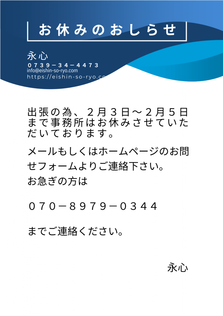 2月3日~5日は出張のため事務所はお休みさせていただきます。メールまたはHPお問い合わせフォームにてご連絡お願いいたします。