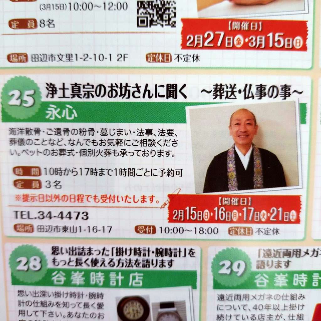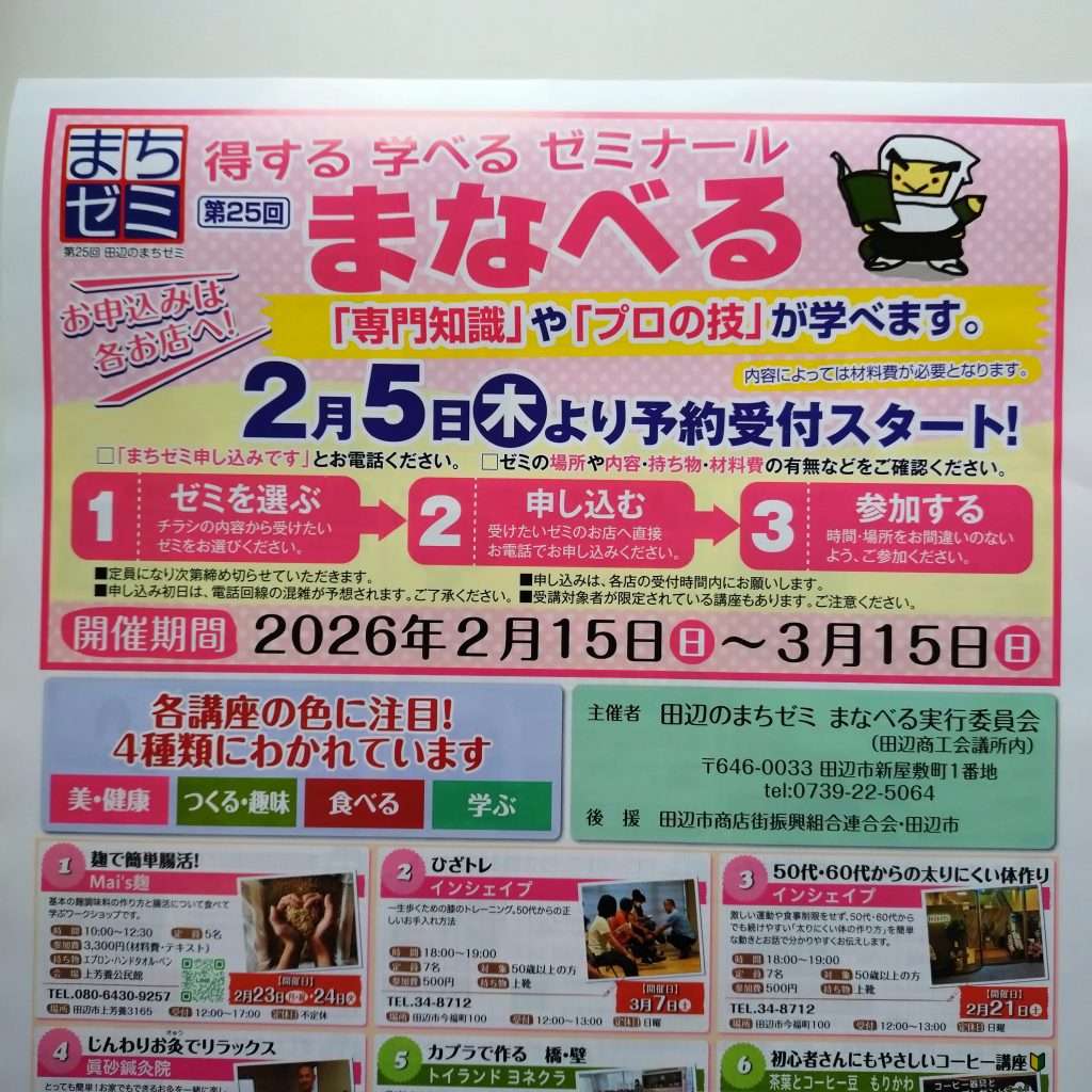 2026年2月15日~3月15日まで、田辺のまちゼミ「まなべる」が開催されます。永心は、2月15日・16日・17日・21日に開催いたします。上記日程以外でも受付いたしておりますので、お気軽にご相談下さい。