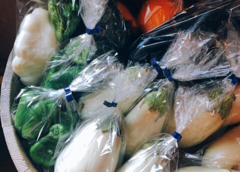 sorrisoさんは、近くの畑で野菜を育てています。お店で提供する料理に自家製野菜を使っているのはもちろん、たくさん実った野菜は玄関脇に並べて販売もしています。