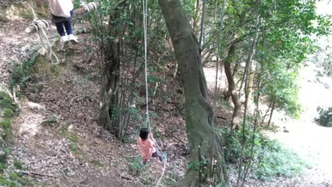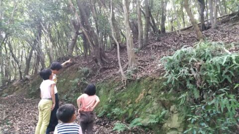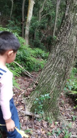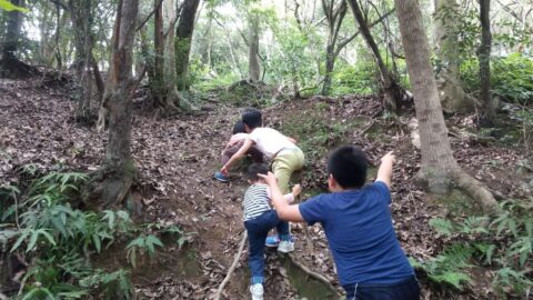子どもたちのうちの一人が「木になっているヤマモモはあるか、探してみる」と言い出すと、他の子どもたちも次々に山の斜面を登り始めました。