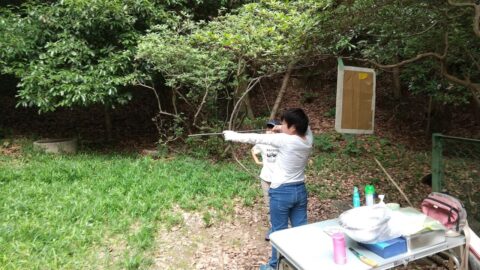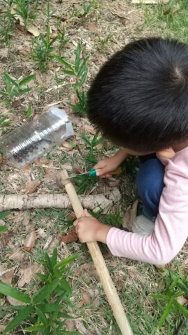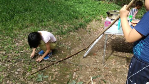 高学年のお兄ちゃんたちは、木とツタで弓矢作りに挑戦中。