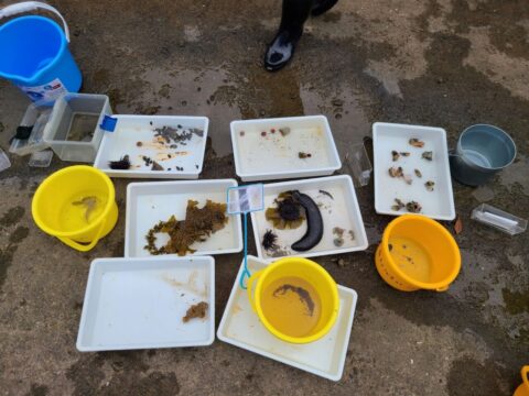 ニセクロナマコ、ウニ、ヒロメ、カサゴ、スベスベマンジュウガニ、ヤドカリなど、いろいろな生き物がたくさん見つかり、みんなで大興奮です。