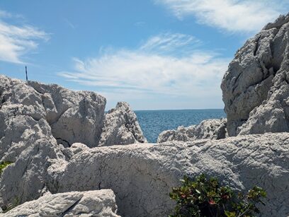 沖を行く大きな船を眺めたり、青と白の濃淡がひと際映える岸壁の角度を探したり、のんびりとした時間を過ごしました。