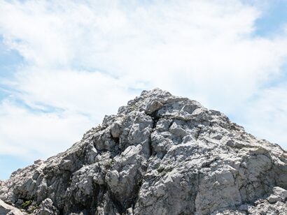 キラキラ光る青い海の上に、粗削りで白い岩山が映えます。