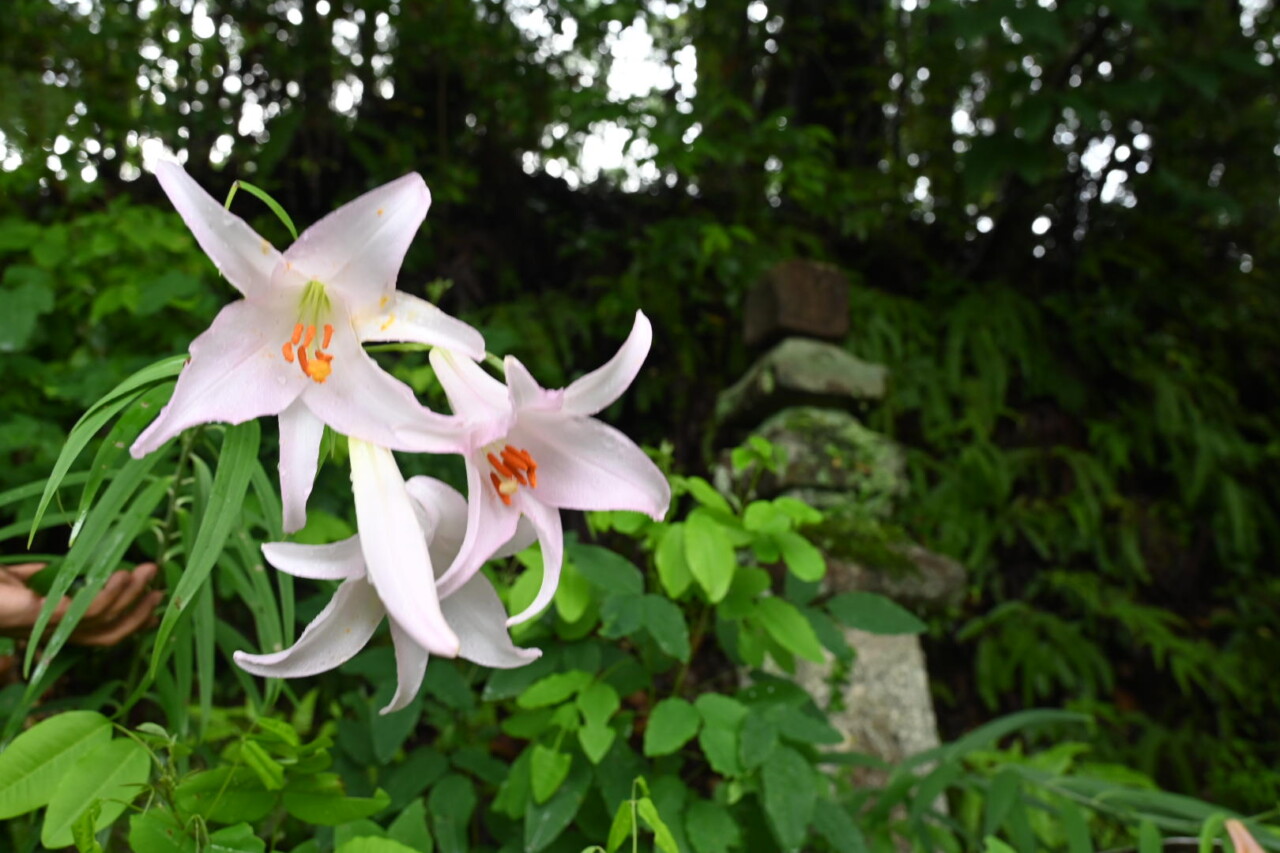 はるばる熊野を目指した巡礼が、初めて熊野本宮大社の姿を見て伏して拝んだという伏拝王子。数輪のササユリが泉式部供養塔に寄り添うように咲いていました。