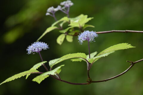 林道の途中にはコアジサイが咲いていました。同じ野生のアジサイでも、ヤマアジサイのような装飾花がないのが特長です。