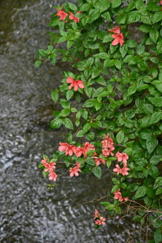 今はちょうどサツキの季節。湯川川に架かる橋のそばには赤いサツキが咲き、新緑に映えます。