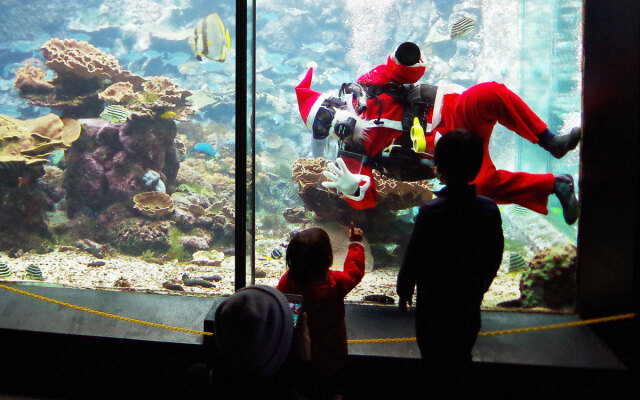 大水槽では、水槽のなかの様子を良く観察できるよう、飼育スタッフが泳ぎながら内側からガラス掃除をしている。今回のイベントではスタッフに代わりサンタクロースが掃除する。水中サンタは、水槽の中をゆっくりと泳いで周り、来場客とジェスチャーでのコミュニケーションをとったり、記念撮影に応える。掃除中、水槽の生き物たちの様子にも注目しよう。- 開催期間