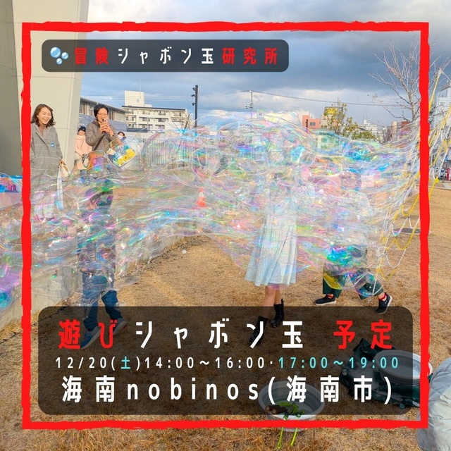 海南nobinosの広場にて、驚くほど大きく膨らんで長く伸びる「巨大シャボン玉」や「巨大スモーク玉」で遊ぶ。写真や動画を撮影しよう。SNS投稿OK。誰でも観覧OK。申込不要。気象条件が合えば「パールバブル(小中大スモークシャボン玉)」や「クラスターバブル(集合体シャボン玉)」、「バブルinバブル(子持ちシャボン玉)」、「銀河バブル(極小子持ちシャボン玉)」も披露。シャボン液がなくなり次第終了。- 開催期間