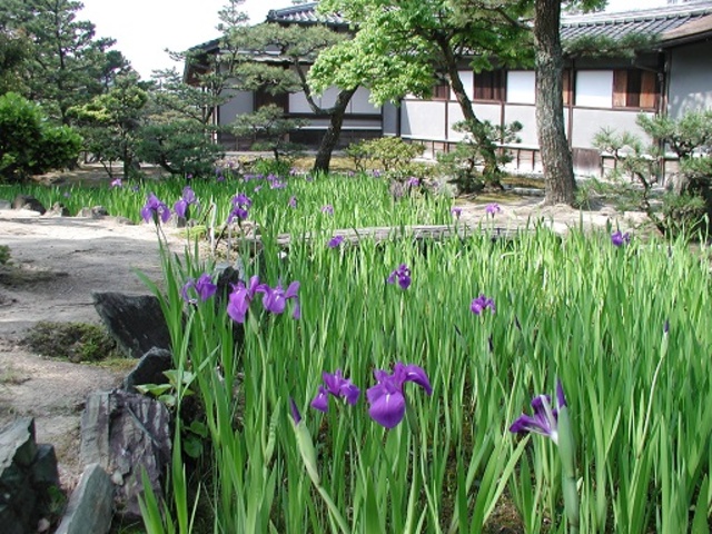 歴史ある庭園で鮮やかに咲き誇るカキツバタ