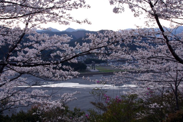 標高260m、眼下に本宮の里を一望できる七越峯。一年のうちでも春の七越峯の眺望は群を抜いて美しく、淡いピンク色に染まった桜のあいまからは、森に囲まれた熊野本宮大社旧社地の大鳥居が見える。約800本のソメイヨシノやシダレザクラ(3月中旬~)、また2018年に新種認定されたクマノザクラ(3月上旬~)を鑑賞できる。七越峯の桜は、熊野川をはさんだ本宮側から大鳥居の背景に眺めるのも幻想的。- 開催期間