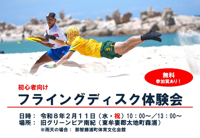 ディスクが1枚あれば、年齢・性別を問わず、誰でも気軽に楽しめるフライングディスク! 世界チャンピオンの指導を受けてフライングディスクを投げられるようになろう! フライングディスク…バスケットボールのようにパスでゴールエリアに攻めるアルティメットや、ディスクを使ったゴルフゲームのディスクゴルフ、遠投競技(ディスタンス)、滞空時間を競う(マキシマムタイムアロフト)など個人8種目、団体2種目がある。- 開催期間