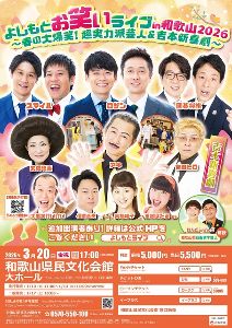 なんばグランド花月などのよしもとの劇場を飛び出して全国各地で開催しているよしもとお笑いライブ! 全国の舞台やテレビで活躍する人気芸人から旬の芸人など、豪華出演者による漫才は、老若男女問わず楽しめる。出演は ロザン、スマイル、囲碁将棋 ほか、 吉本新喜劇(アキ、末成映薫、吉田ヒロ、高橋靖子、信濃岳夫、大黒笑けいけい、重谷ほたる ほか)。