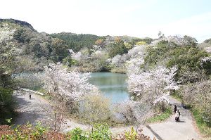 ひき岩群国民休養地内に位置する動鳴気峡。3月下旬頃から、山桜・ソメイヨシノなどの桜が咲き始める。岩口池周辺の遊歩道では桜が咲き誇る中を散策でき、夜には桜がライトアップされ素晴らしい景色が望める。