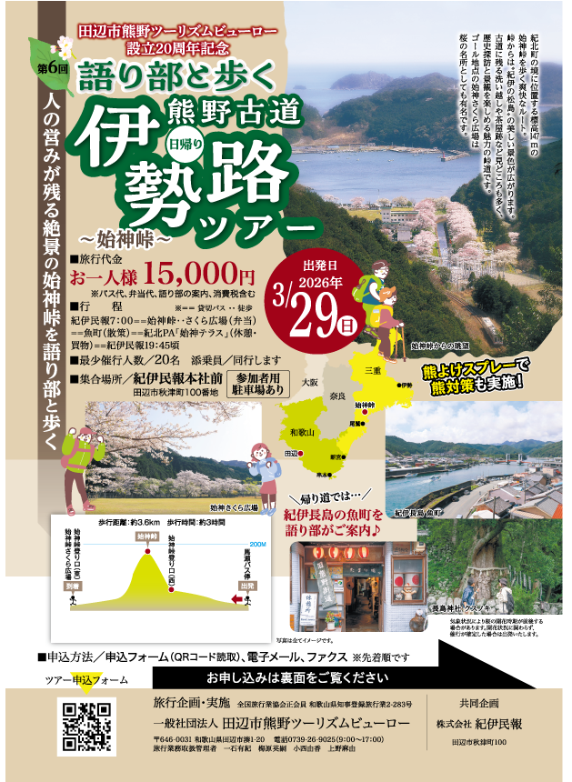 紀伊民報7:00==始神峠‥さくら広場(弁当)==魚町(散策)==紀北PA「始神テラス」(休憩・買物)==紀伊民報19:45頃