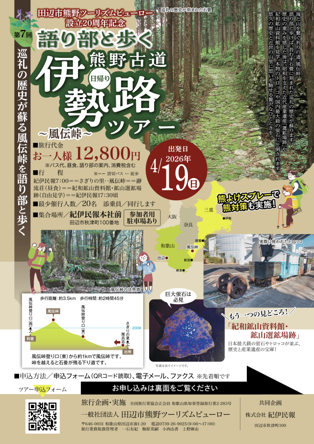 この旅行は、一般社団法人田辺市熊野ツーリズムビューロー(以下当社と言います。)が、企画・実施する旅行であり、この旅行に参加されるお客様は、当社と募集型企画旅行契約(以下「旅行契約」と言います。)を締結することになります。旅行契約の内容・条件は、パンフレット等、本ご旅行条件書、出発前にお渡しする最終旅行日程表と称する確定書面及び、当社旅行業約款募集型企画旅行契約の部(以下「当社約款」といいます。)によります。