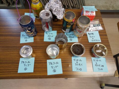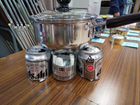 他にも、空き缶を使用して非常用コンロも♪こちらは鍋でお湯を沸かしたり、煮炊きができるので