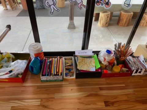 窓際の明るい子どもサイズのカウンターには、色鉛筆や折り紙が並んでいます。ここは子どもたちが自由にお絵かきや工作ができるスペース。