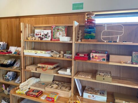 カウンターの横には小上がりのスペースがあります。ここでは棚に並んだ「木のおもちゃ」で遊ぶことができます。見たことがないおもちゃに子どもたちは興味津々。温かみのある木の製品は安心して遊ばせることができます。