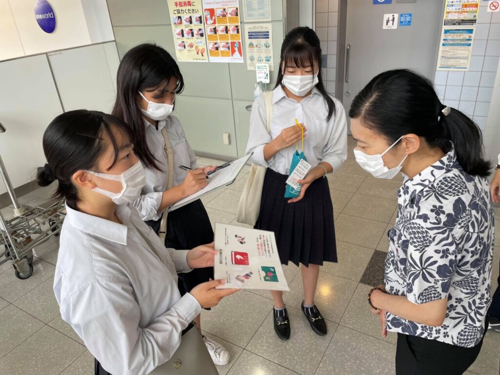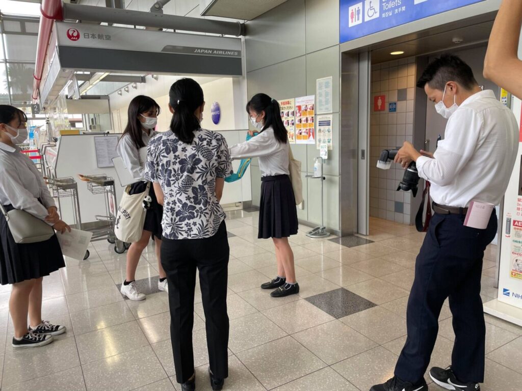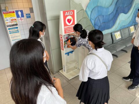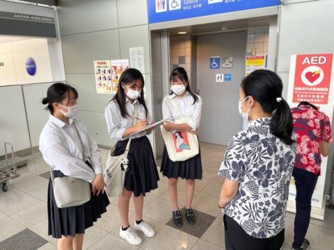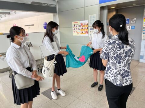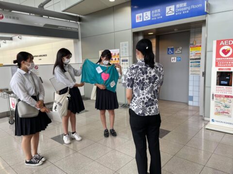 熊野高校Kumanoサポーターズリーダー部は、2021年8月25日(水)に南紀白浜空港で、AEDシートの贈呈式を行った。3年生3名が参加し、AEDシートを開発した経緯と使用方法や取扱説明書について、空港関係者の方に説明をした。