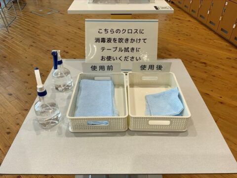 ALECでは、使用するテーブルを除菌できるよう、アルコールスプレーとクロスが用意されていました。