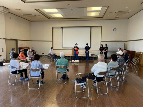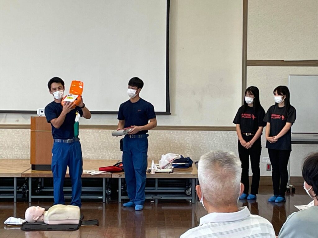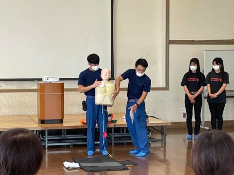 熊野高校Kumanoサポーターズリーダー部は、2021年10月10日(日)、ひがしコミュニティセンター(和歌山県田辺市新万)にて防災学習会(あけぼの町内会)田辺市消防署による心肺蘇生講習会でAEDシートを紹介した。