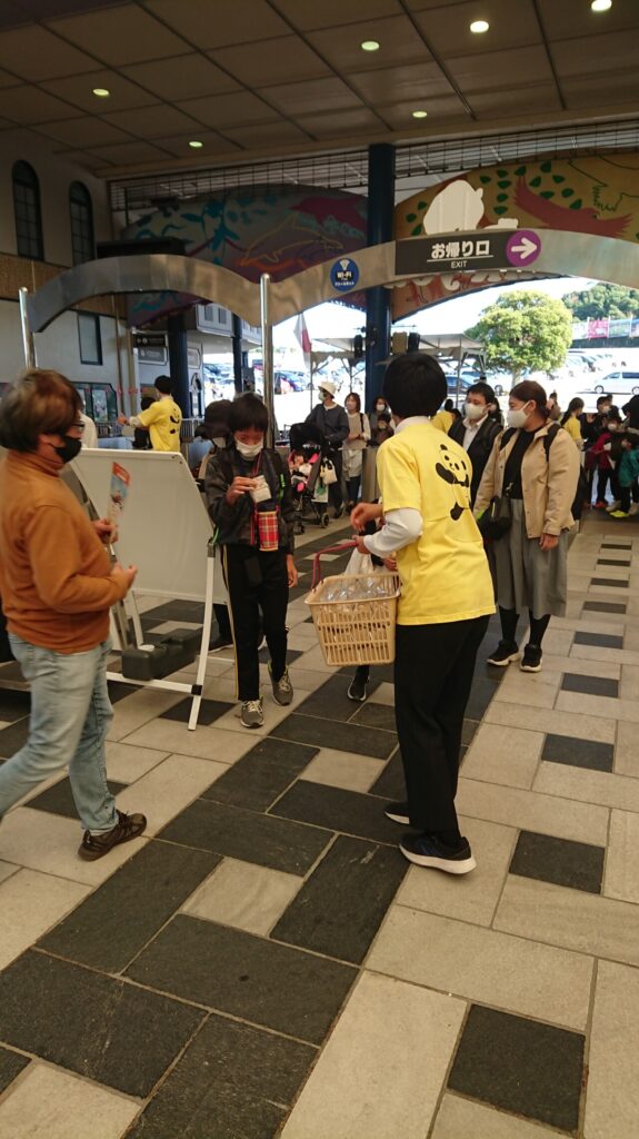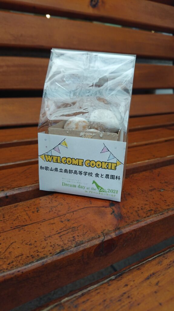 このクッキーは、本校食と農園科・食文化探究コース1・2年生が、実習の授業で製造した物で、スノーボールクッキー3500個を小分けにし、約500組に配布しました。貴重な機会を提供していただいたアドベンチャーワールド様、来場者の皆さま、ありがとうございました。