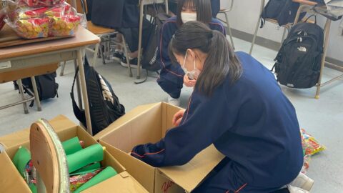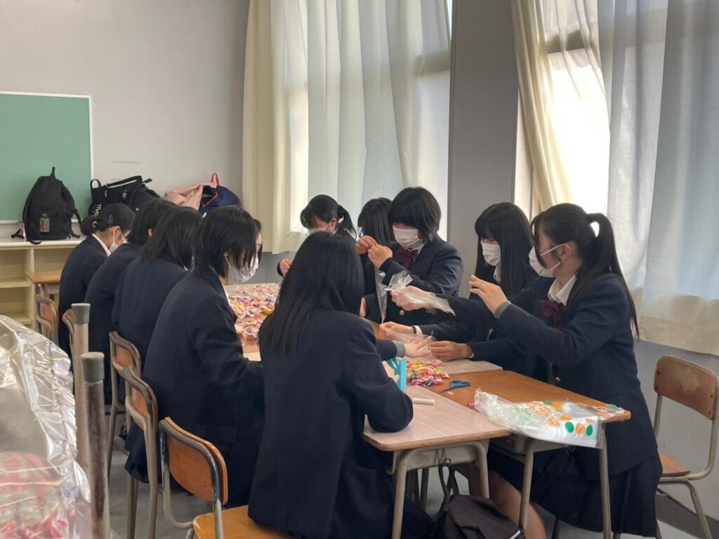 熊野高校Kumanoサポーターズリーダー部は、2022年3月15日(火)に、上富田社会福祉協議会からの依頼で、子ども達に配るお菓子を可愛くポシェット状に詰めるボランティア活動を行った。