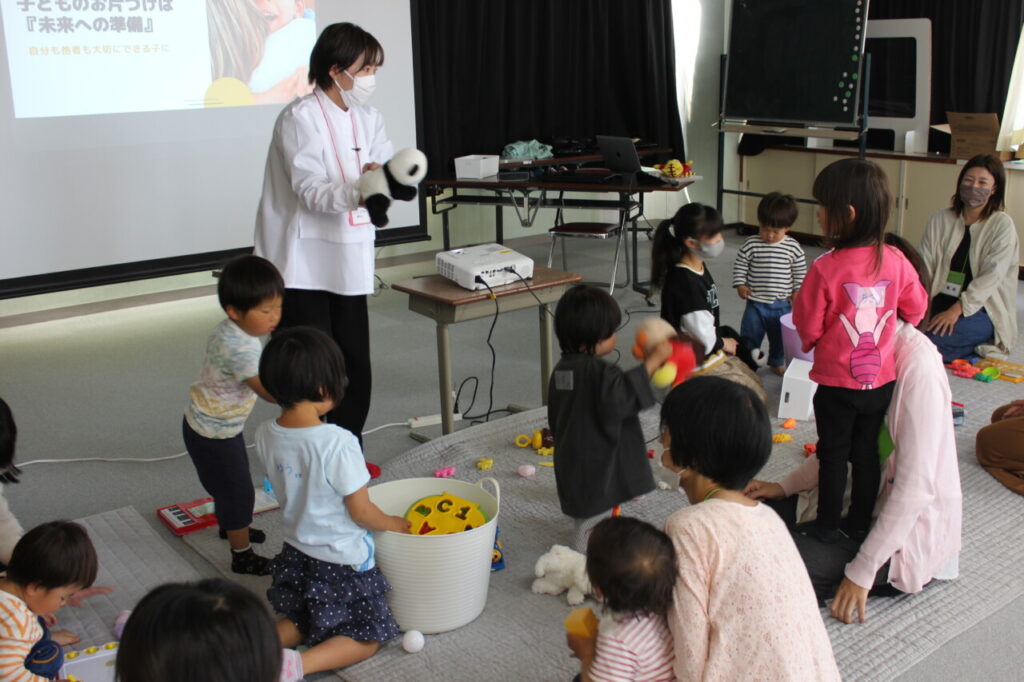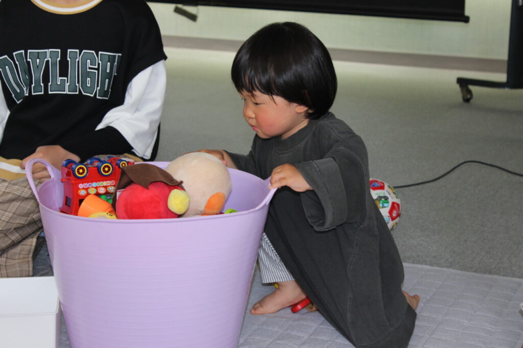 そして、お片付け遊びワンツーSTEPでは、ちょっとした工夫で上手にお片付けにつながることを学びました。講座中、子どもちゃんたちは自由におもちゃを出して遊んでいましたが、音楽がなり、二つのカゴにおもちゃを片付ける競争が始まったり、しまじろうやアンパンマンと一緒にお片付けをしたり、などなど(*^-^*)楽しい気持ちで、ゲーム感覚でお片付けが出来ました。ついつい、「早くして!」「片付けて!」と言葉を投げかけるだけの時がありますが、、、(>_<)ちょっとした工夫でお片付けにつながり、お母さんの気持ちはいつもより余裕が出てくると思いますよ。お片付けが出来たら、目一杯褒めてあげてくださいね♡