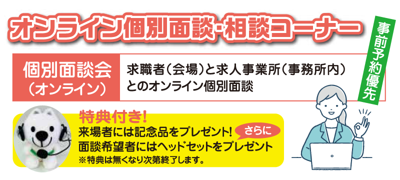 ●求職者(会場)と求人事業所(事務所内)とのオンライン個別面談となります。