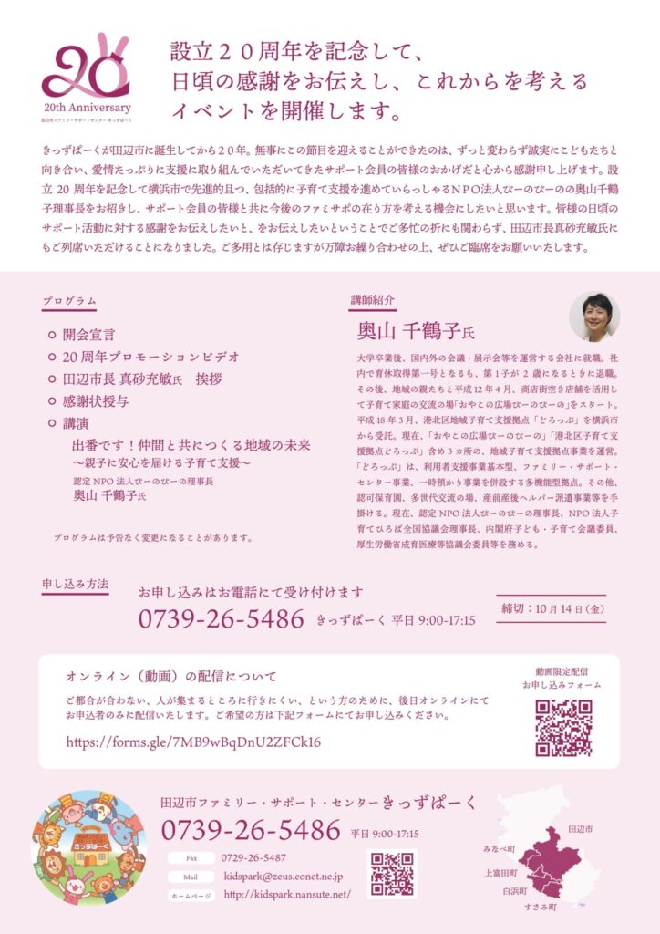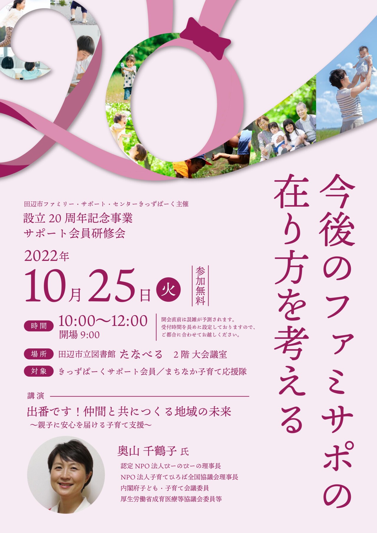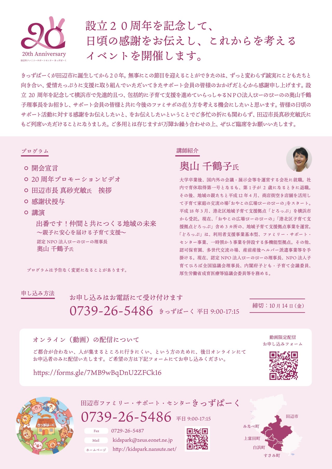 きっずぱーくが田辺市に誕生してから20年。無事にこの節目を迎えることができたのは、ずっと変わらず誠実にこどもたちと向き合い、愛情たっぷりに支援に取り組んでいただいてきたサポート会員の皆様のおかげだと心から感謝申し上げます。設立20周年を記念して横浜市で先進的且つ、包括的に子育て支援を進めていらっしゃるNPO法人びーのびーのの奥山千鶴子理事長をお招きし、サポート会員の皆様と共に今後のファミサポの在り方を考える機会にしたいと思います。皆様の日頃のサポート活動に対する感謝をお伝えしたいと、ご多忙の折にも関わらず、田辺市長真砂充敏氏にもご列席いただく予定です。