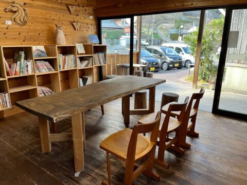開放的なオープンデッキから中をのぞくと、大きな木のテーブルと椅子、チェーンソーアートの作品、そして、たくさんの絵本が目に入ってきます。
