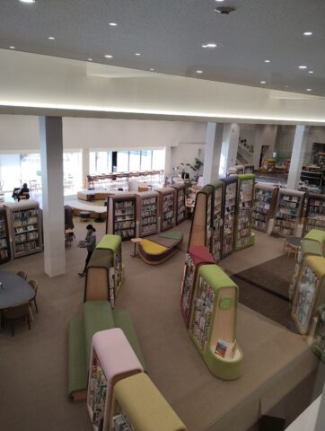 エントランスのある2階のライブラリーは、柔らかい本棚で作られた迷路のような空間が広がっています。5万冊の絵本が取りそろえられていました。