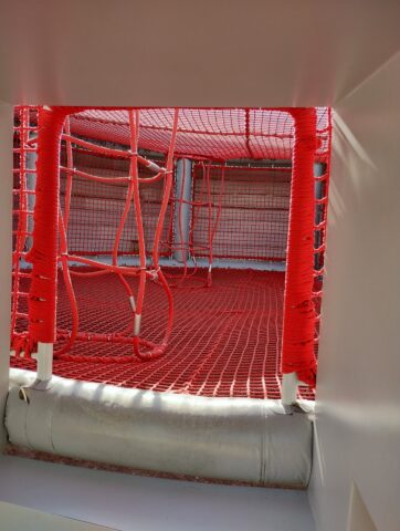 屋外に、アリの巣をイメージした遊具と、鳥の巣のようなネット遊具があります。
