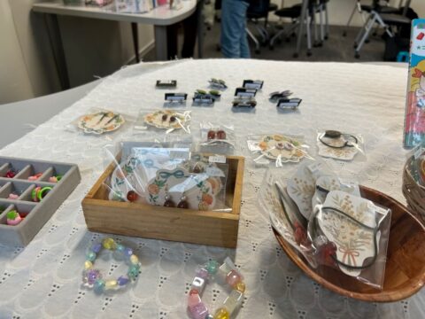 イベント会場に到着するとガラス張りの室内が見えます。アクセサリーや絵本などが並べてあり、小さなマルシェのような雰囲気。