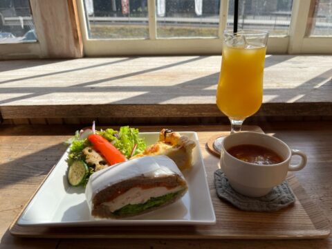 甘夏ミカンのジュースは、きちんと酸味があって体がシャキッとします。ドレッシングがおいしいサラダ、具だくさんトマトベースのスープ、ジャガイモのキッシュにチキンのサンドイッチ。サンドイッチにちょこっと入っているスモークサーモンが味を引き締めてくれます。それぞれの具材の味がしっかりしていて、ボリューム満点でした。