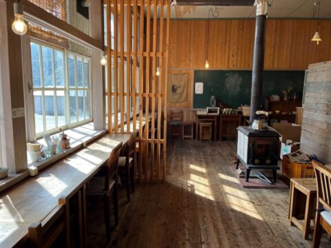少し視線を上げると陽をあびた山の景色。コーヒーの豆を挽く音、お客さんたちの楽しそうな会話。優しく背中を温めてくれる薪ストーブ。