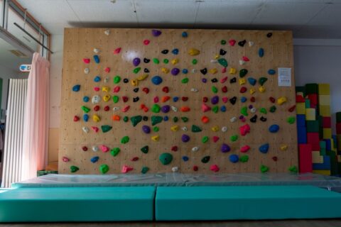 明るいスペースには、なんと子ども用のボルダリングの壁があります。