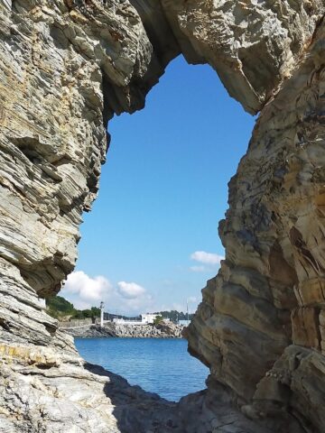 岩には自然に開いた穴があり、その向こうの景色をレンズ越しにのぞいてみたら、思いがけず迫力のある写真が撮れました。