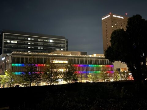 カラフルなイルミネーションと屋上のライトアップが際立ちます。
