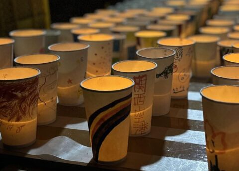 紙コップには絵や文字が描かれていて、ろうそくの炎に照らされています。