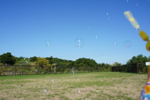 子どもたちはシャボン玉を追いかけ、広場を走り回り楽しんでいました。