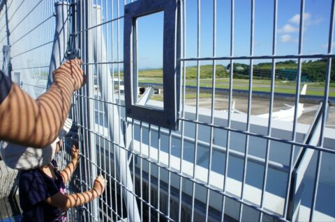屋上にある展望デッキには台があり、上に立って滑走路を見ることができます。柵には所々に小さな窓があり、子どもが背伸びをしてのぞき込んでいました。