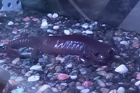 この生物は、和歌山県指定天然記念物の両生類「オオダイガハラサンショウウオ」。上が大人で下が子どもです。