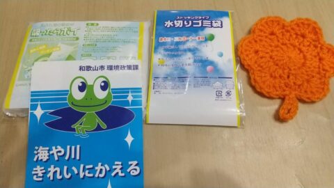 学習会参加者には、和歌山市から「水切りゴミ袋」と「天ぷら油の吸収剤」「アクリルたわし」のお土産がありました。
